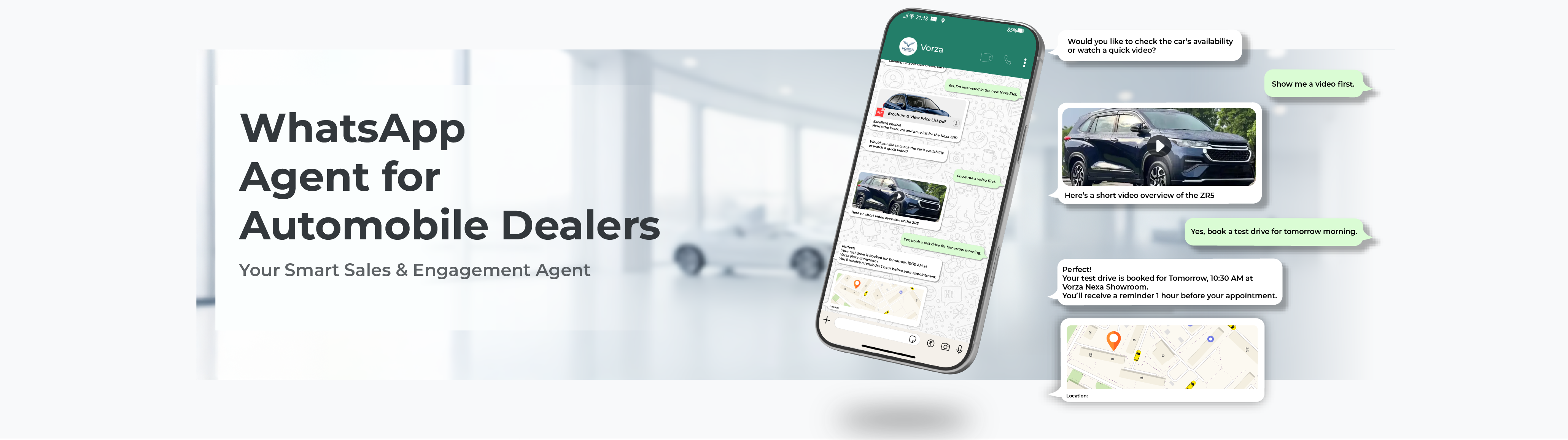 Car buyers want instant access to vehicle details, offers, and availability. With a WhatsApp automobile agent, you can provide brochures, price lists, videos, and book test drives directly β creating a seamless, interactive buying experience.
